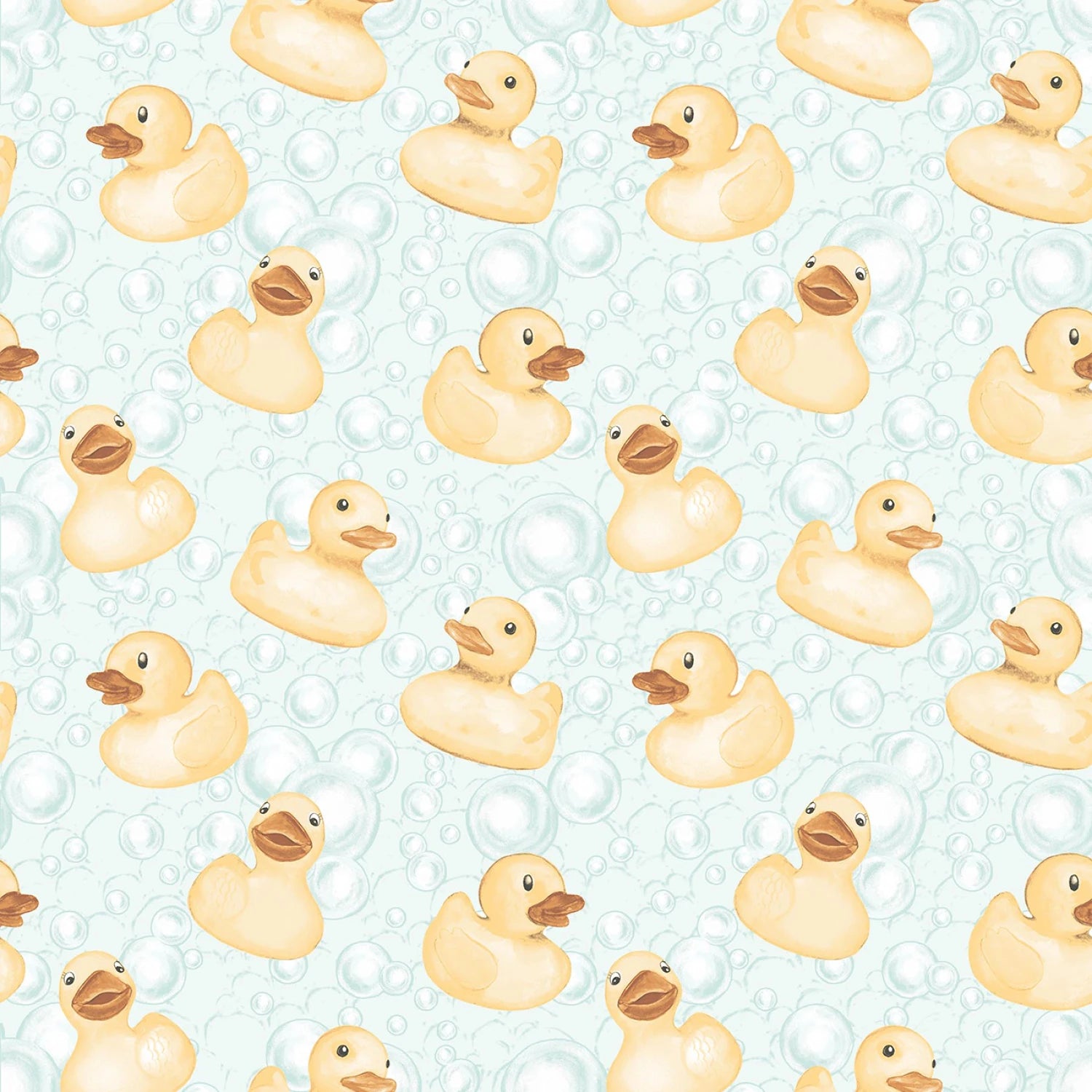 This delightful fabric features a charming pattern of mint-colored rubber duckies floating amidst bubbles, set against a soft, light blue background. The design is playful and perfect for creating baby items, children's clothing, or whimsical home decor projects.
