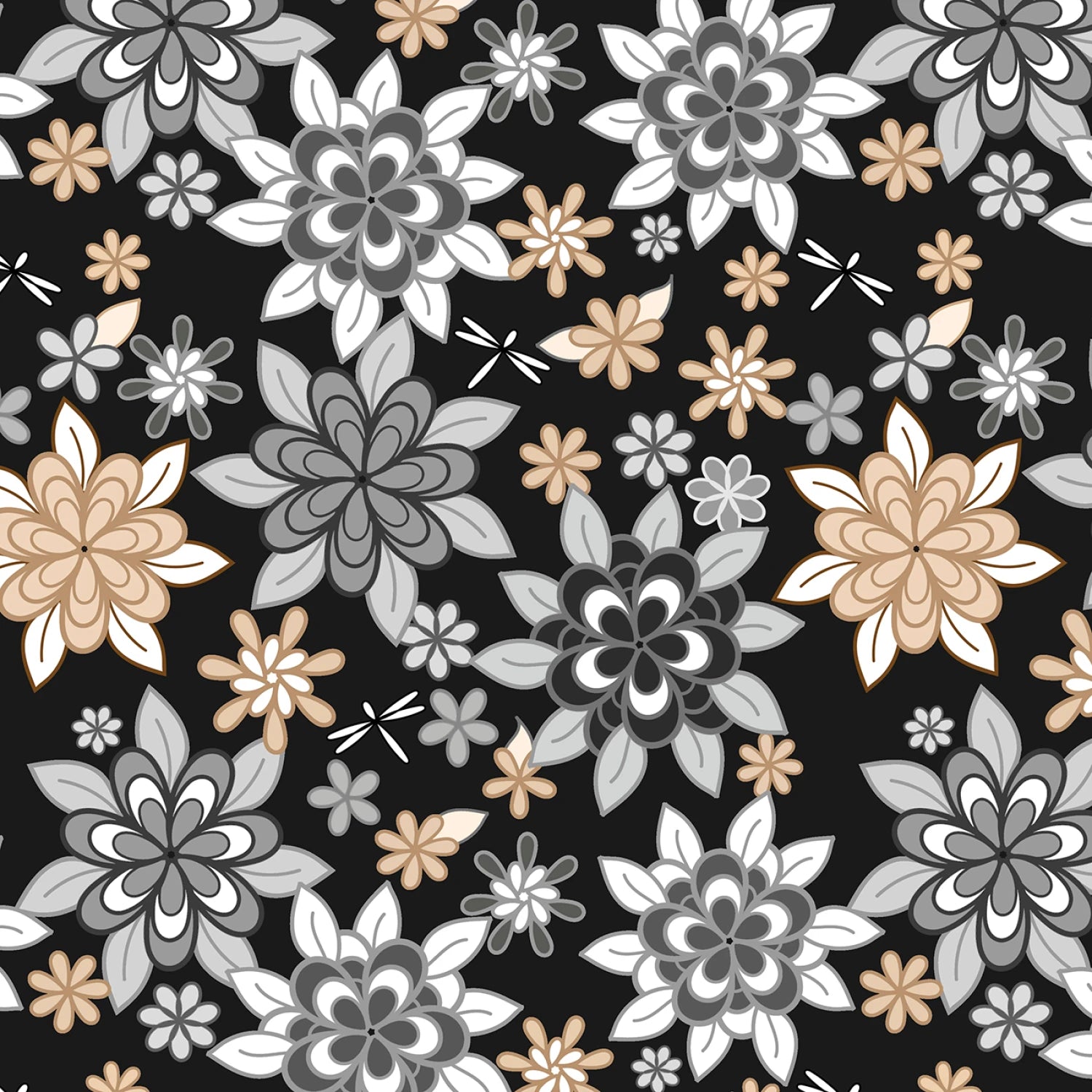 Elevate your crafting and upholstery projects with this captivating large floral black fabric, featuring an enchanting array of oversized blooms and delicate dragonflies scattered across a deep black background. The stylized flowers bloom in soft shades of gray, beige, and white, creating a sophisticated contrast that adds a touch of whimsical elegance to any design. Perfect for quilting, home decor accents, or custom apparel, this versatile material invites creativity with its intricate petal details and subtle insect motifs, blending modern flair with timeless appeal. Whether you're sewing throw pillows, curtains, or unique garments, the smooth texture and bold pattern ensure your creations stand out with effortless style and charm.