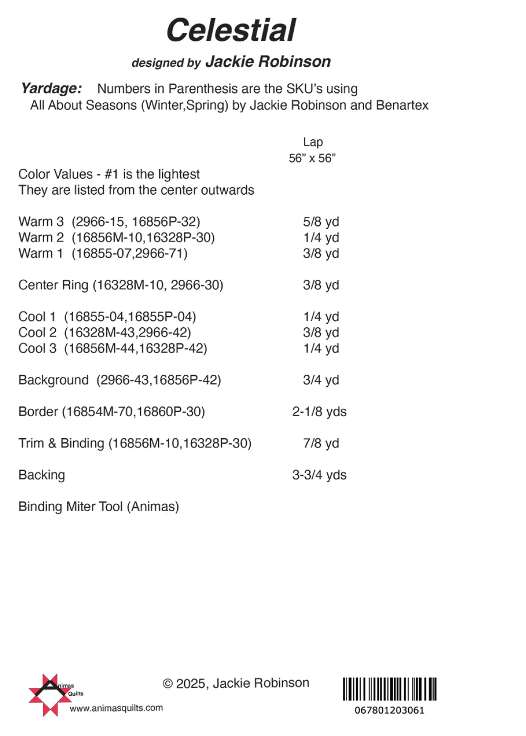 Celestial is a gorgeous Lone Star quilt, designed for a lap or as a wall hanging, it is a stunner! Featuring fabric from 'All About Seasons' by Jackie Robinson and Benartex, this pattern includes measurements for both the Winter and Spring fabric! Available in Lap size "56 x"56