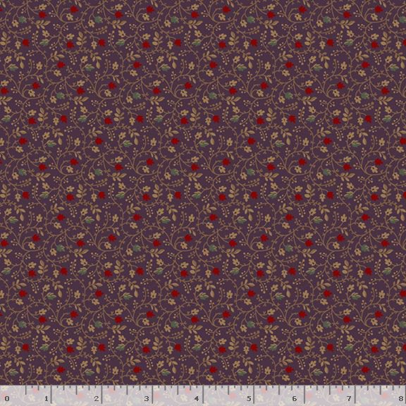 .This enchanting fabric features a delicate floral pattern with small, intricately detailed flowers and leaves scattered across a rich purple background. The design evokes a sense of a secret garden, with its classic and timeless appeal, making it perfect for a variety of crafting projects from quilting to apparel.